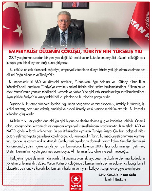 Vatan Partisi İzmir İl Başkanı İhsan Sefa, 2026 yılına girerken yaptığı yazılı açıklamada, küresel siyasette tek kutuplu emperyalist düzenin çözülme sürecine girdiğini belirterek, Türkiye’nin bu yeni dönemde tarihsel ve stratejik bir rol üstleneceğini vurguladı.