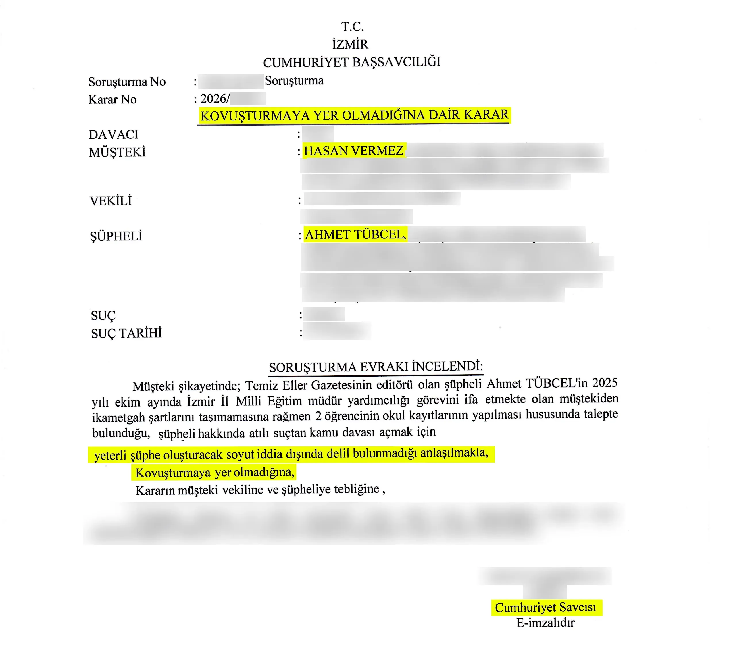 İzmir İl Milli Eğitim Müdür Yardımcısı Hasan Vermez’in, Temizeller Genel Yayın Yönetmeni usta gazeteci Ahmet Tübcel’e yönelik “iki öğrenci kaydı” üzerinden yönelttiği tehdit ve şantaj iddiaları yargıdan döndü. İzmir Cumhuriyet Başsavcılığı, iddiaların soyut kaldığı ve somut hiçbir delille desteklenmediği gerekçesiyle “Kovuşturmaya Yer Yoktur” (KYOK) kararı verdi.
