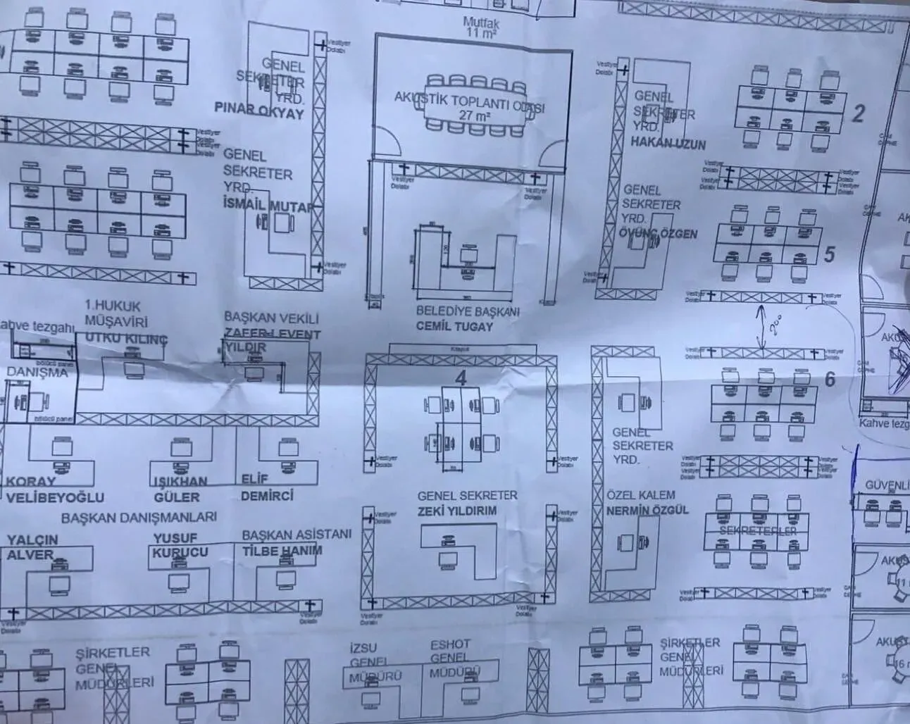 Hazırlanan plana göre, Başkan Tugay’ın yanı sıra genel sekreter, genel sekreter yardımcıları, başkan yardımcıları ve belediye iştirak şirketlerinin genel müdürleri tek bir mekânda bir araya gelecek. Tugay’ın masası holün tam merkezinde yer alacak; etrafında hiçbir duvar, bölme veya kapı bulunmayacak.