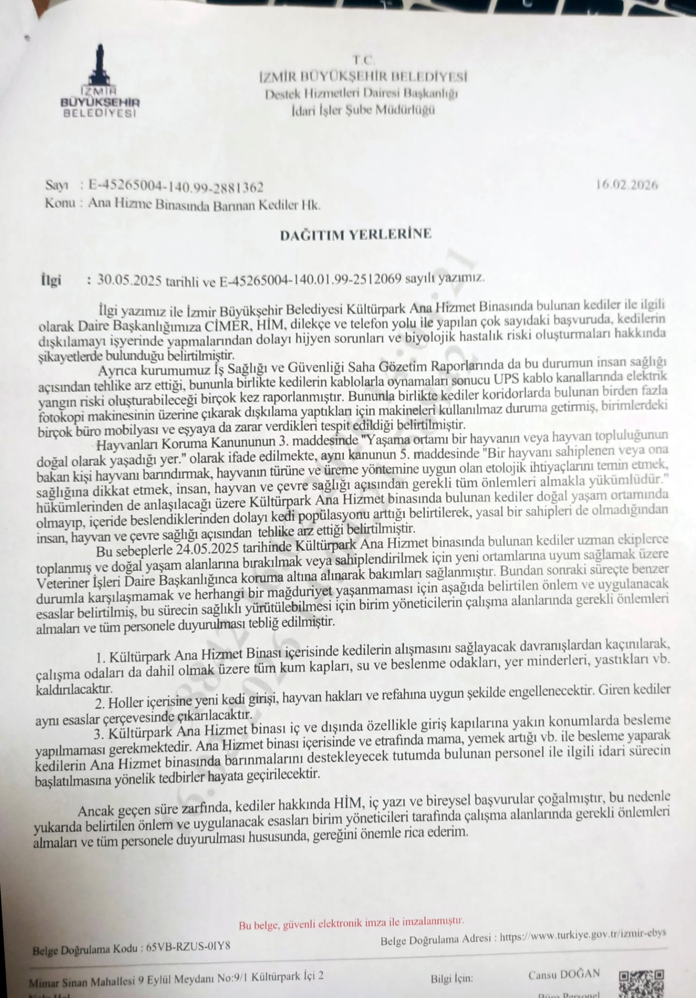 Ayrıca kedileri mama veya yemek artıklarıyla besleyerek binada barınmalarını teşvik eden personel hakkında idari işlem başlatılabileceği de yazıda yer aldı.