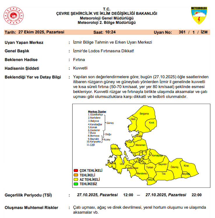 Meteoroloji 2. Bölge Müdürlüğü, öğle saatlerinden itibaren rüzgarın güney ve güneybatı yönlerinden kuvvetli eseceğini, kısa süreli fırtına şeklinde (50-70 km/saat, yer yer 80 km/saat) etkili olacağını açıkladı. Yetkililer, kuvvetli rüzgarın çatı uçması, ağaç ve direk devrilmeleri ile ulaşımda aksamalara yol açabileceğine dikkat çekti. Lodos uyarısı İzmir’in tamamını kapsıyor ve 27 Ekim Pazartesi saat 12:00’den 22:00’ye kadar geçerli olacak.