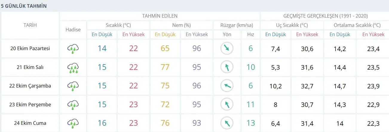 Gündüz sıcaklıklarının ortalama 22°C, gece sıcaklıklarının ise 15°C civarında seyredeceği hafta boyunca, ıslak ve serin bir hava hakim olacak.