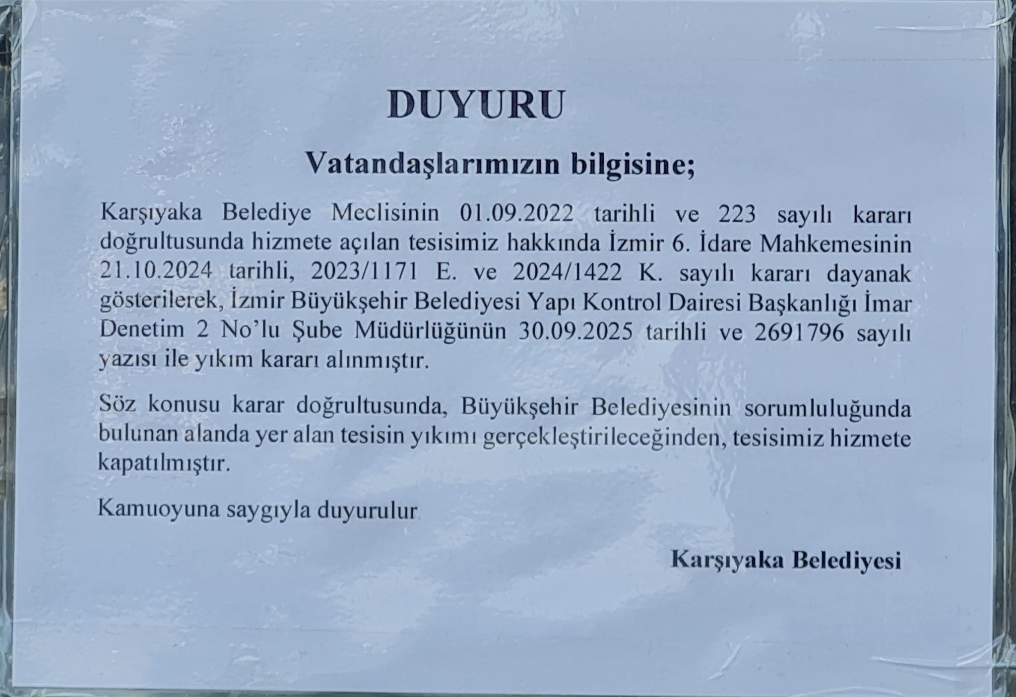 “Karşıyaka Belediye Meclisinin 01.09.2022 tarihli ve 223 sayılı kararı doğrultusunda hizmete açılan tesisimiz hakkında İzmir 6. İdare Mahkemesinin 21.10.2024 tarihli, 2023/1171 E. ve 2024/1422 K. sayılı kararı dayanak gösterilerek, İzmir Büyükşehir Belediyesi Yapı Kontrol Dairesi Başkanlığı İmar Denetim 2 No'lu Şube Müdürlüğünün 30.09.2025 tarihli ve 2691796 sayılı yazısı ile yıkım kararı alınmıştır.”